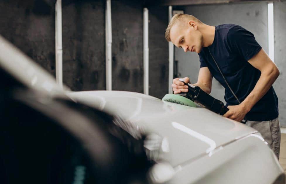 En avant-dernière étape figure le polissage de la carrosserie pour corriger des défauts tels que les rayures à l’aide d’une polisseuse.