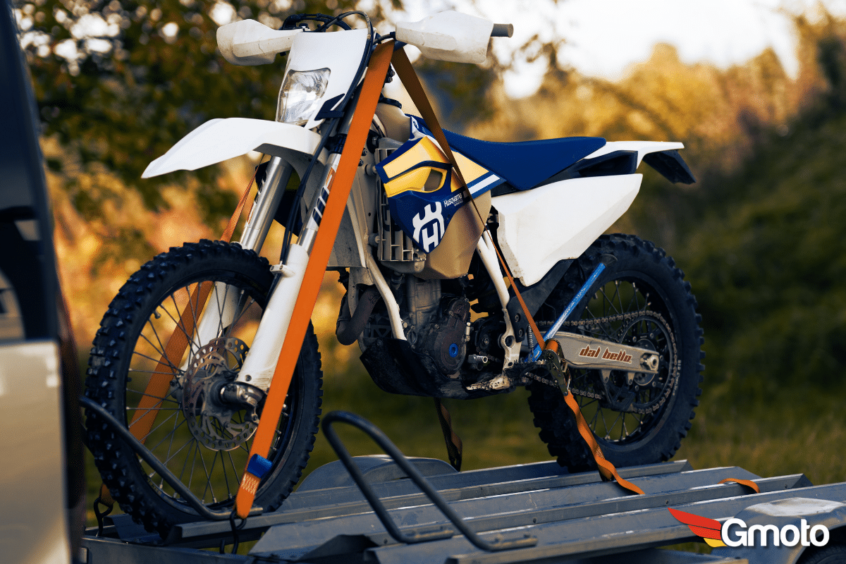 Si vous vous demandez comment transporter une moto sur une remorque, nous avons une bonne nouvelle pour vous : vous aurez besoin des mêmes accessoires que pour le transport dans une fourgonnette. Une rampe solide (assurez-vous que la capacité de charge de la rampe correspond au poids de la moto – une simple planche ne suffit pas) et des sangles de transport feront l’affaire. Comme mentionné précédemment, ne serrez pas trop les sangles – cela pourrait endommager la suspension. Assurez-vous également que les sangles ne touchent pas des bords tranchants ou des éléments fragiles (par exemple, équipements, protections en plastique ou éléments en aluminium fin). Il est également recommandé de protéger la peinture de la moto – si vous devez fixer une sangle de transport sur les carénages ou le réservoir de carburant, utilisez du ruban adhésif ou un matériau fin à l’endroit du contact.